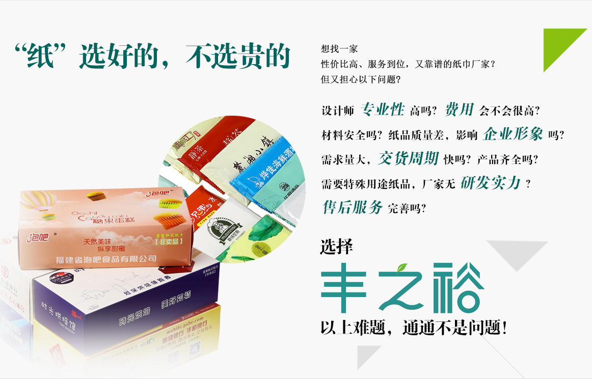 品质保障。丰之裕纸业采用恒安纸业所提供原纸加工纸品,降解环保,质量保证。完善的检测设备,450℃高温消毒,全自动无菌生产,干净卫生。通过ISO9001国际质量体系认证,坚信“产品自身是质量检验的唯一标准”! 多一份绿色,多一份健康!
